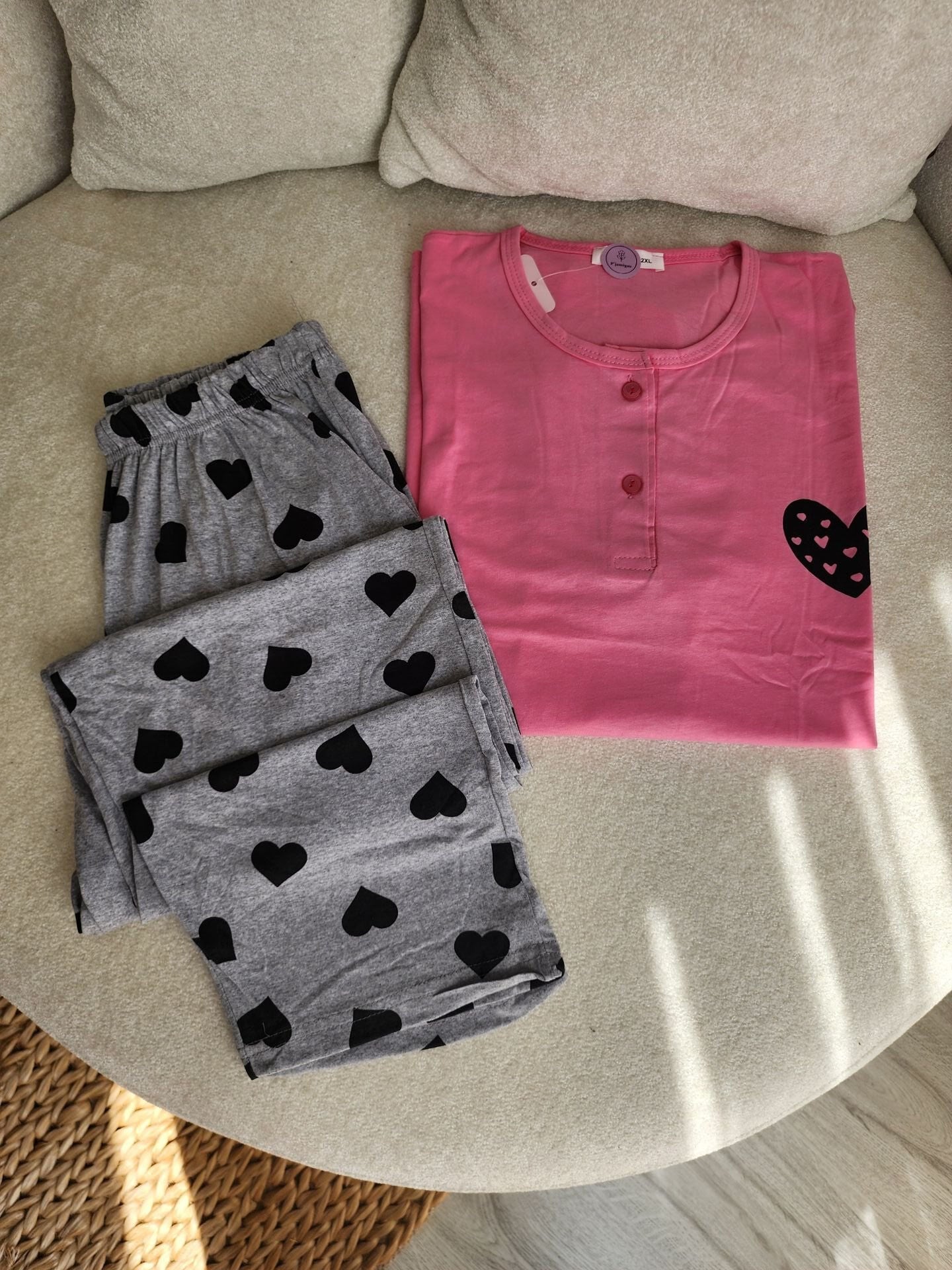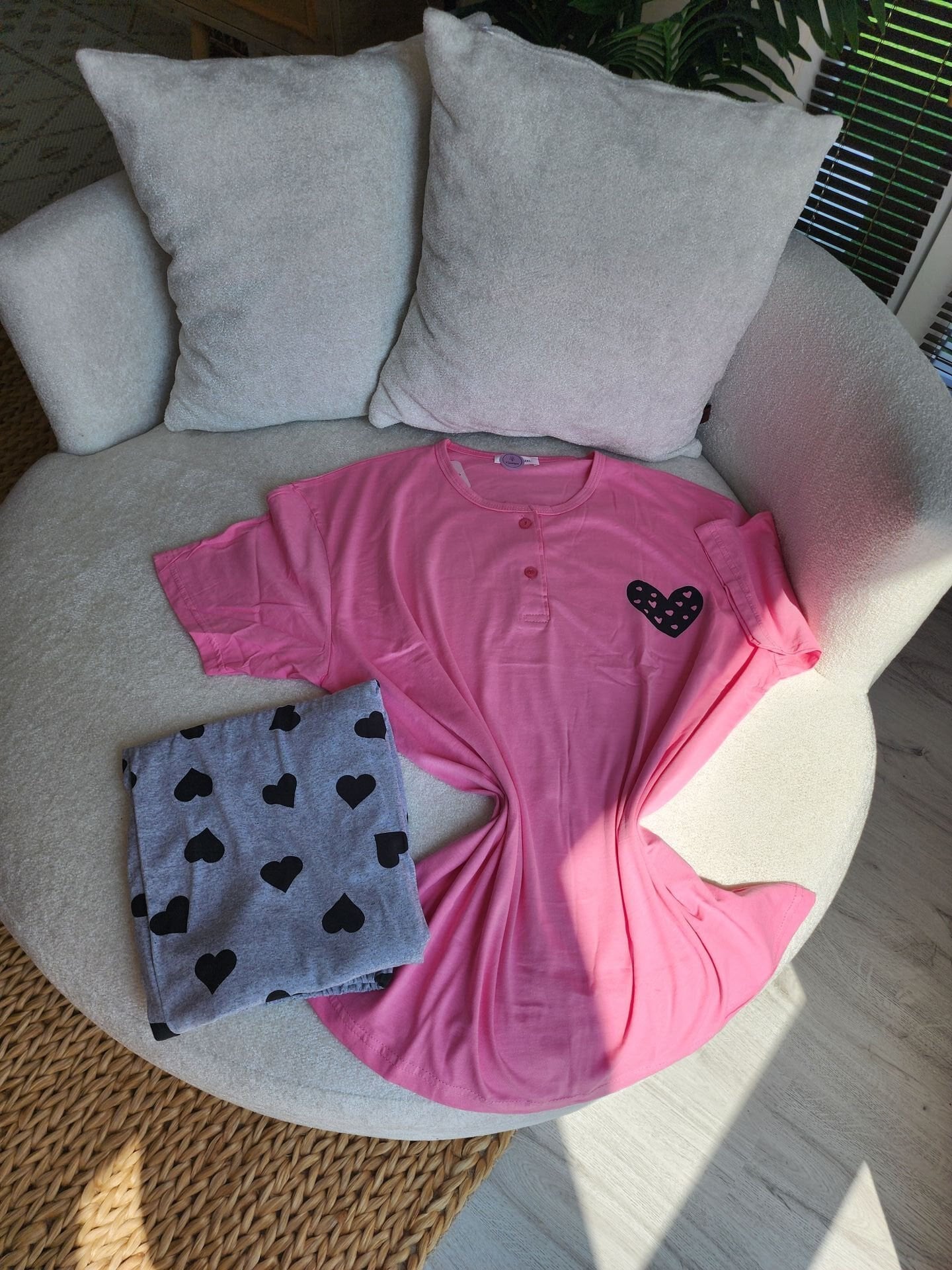 Fushia Heart Penye Büyük Beden Pijama Takımı - Kısa Kollu