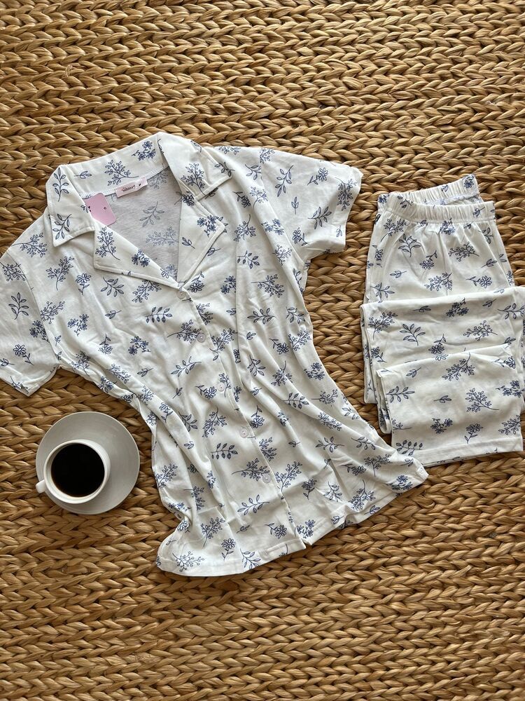 Süprem Mavi Çiçekli Pijama Takımı - Kısa Kollu