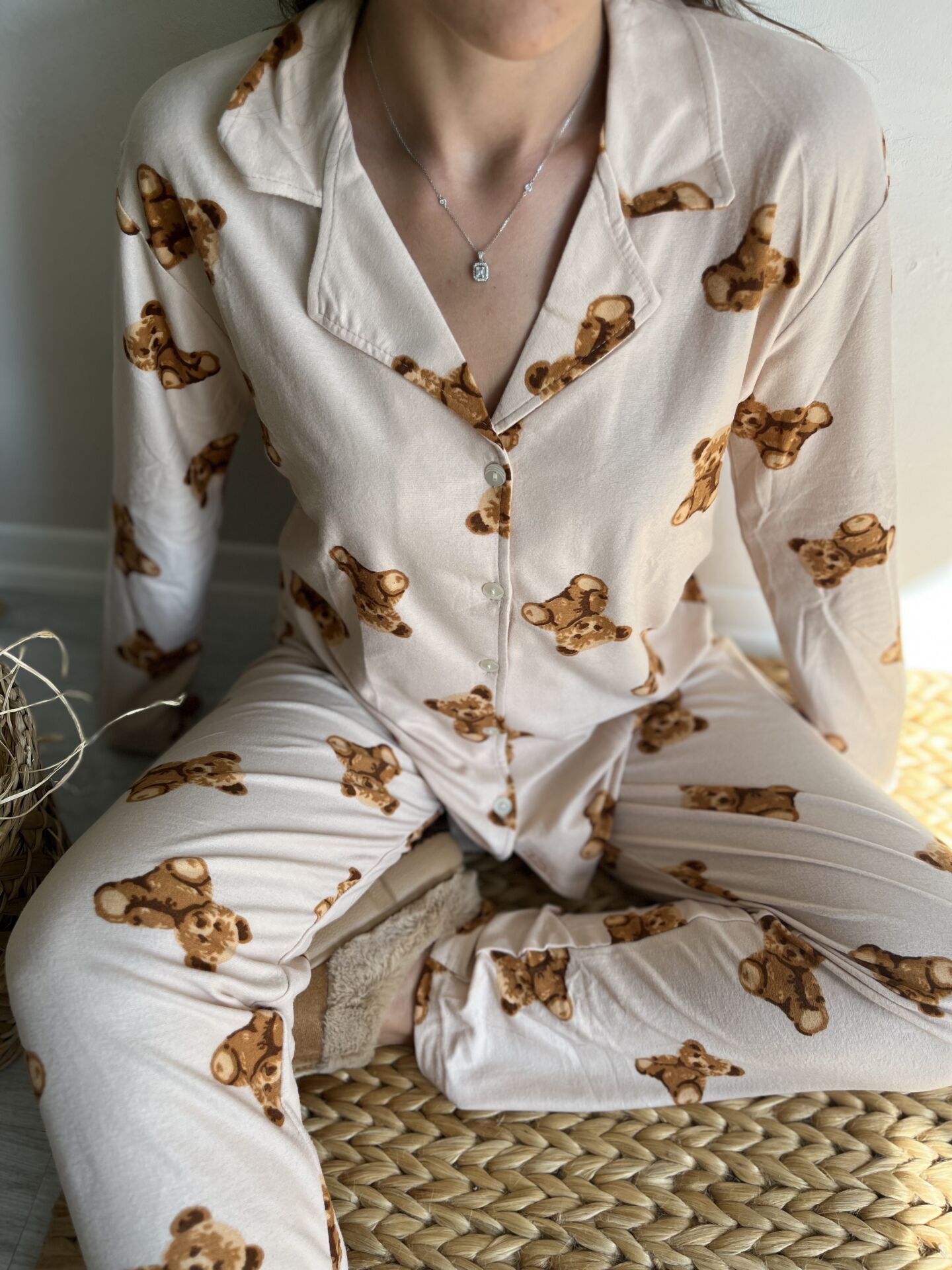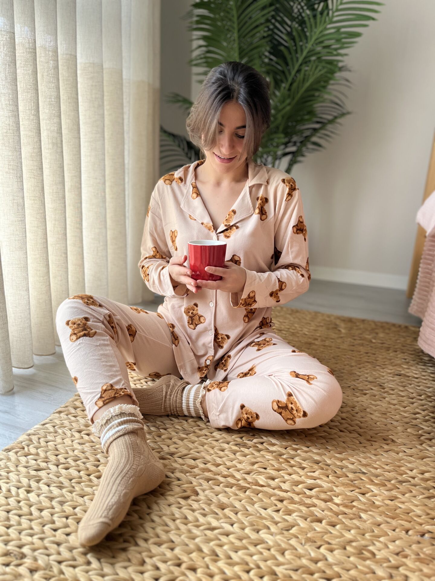 Teddy Bej Renk Ayıcık Kadın Pijama Takımı - Uzun Kollu